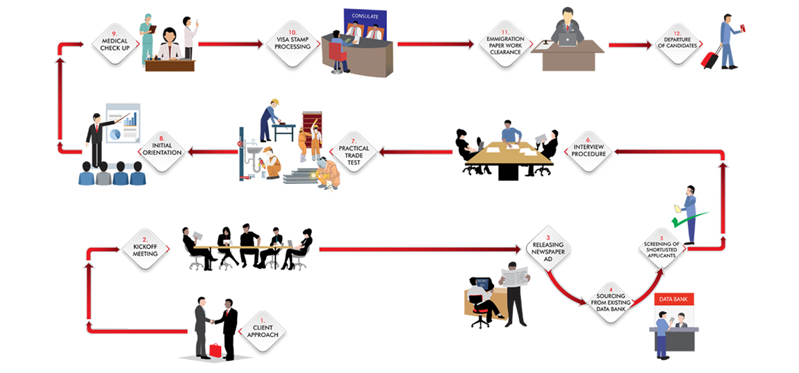 We always prefer selection of applicant either by oral or practical test to be conducted by the employer or his authorized representative. We arrange his /their accommodation, transport and all other logistic support required for the purpose. In case we are entrusted with the selection & testing of worker, we normally do it with the help of a team of experts for technical & professional categories under direct supervision of our professional executives.